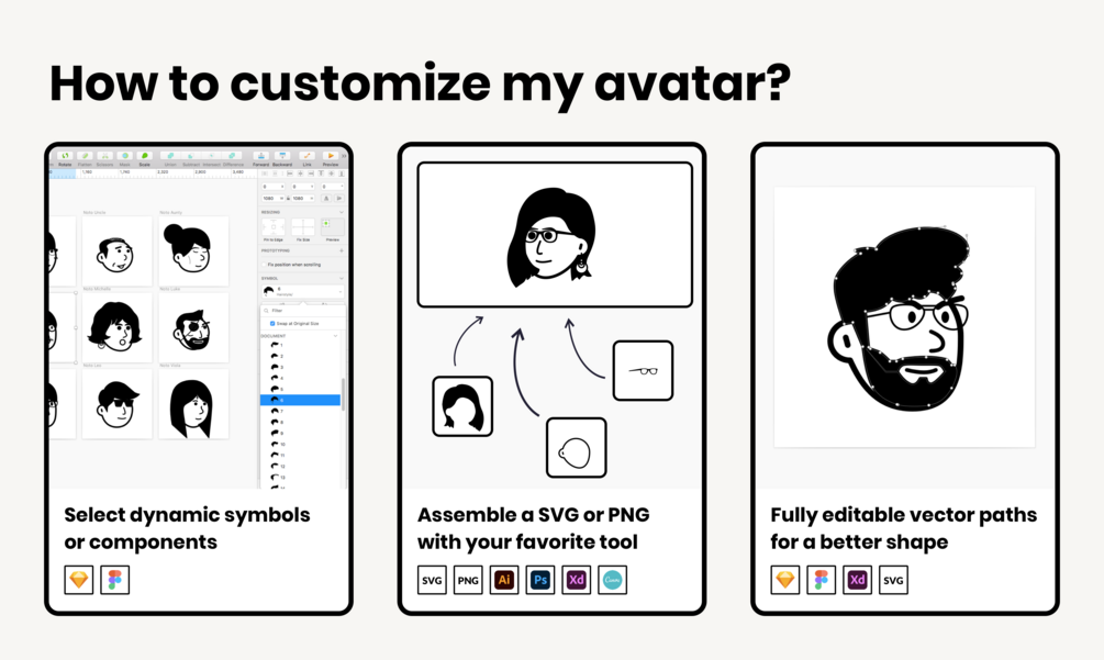 You can use any design tool, such as Sketch or Figma, to modify your avatar's appearance based on its nested components. This is how you can generate an avatar on Figma, watch this video. Also, you can layer and place components wherever you like.